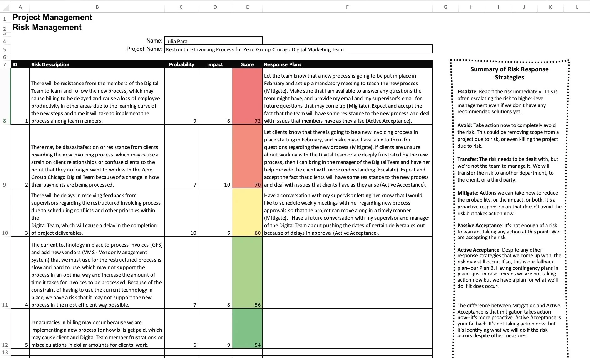 This document details various risks that may occur throughout the project dictated by multiplying the probability of the risk’s occurrence (on a scale of 1-10) by the impact of the potential risk (on a scale of 1-10). The three highest ranked have subsequent response plans in order to mitigate risk as much as possible. It shows perceived data in action to create a visual spreadsheet for reference throughout the project in order to produce the most seamless and successful outcome.